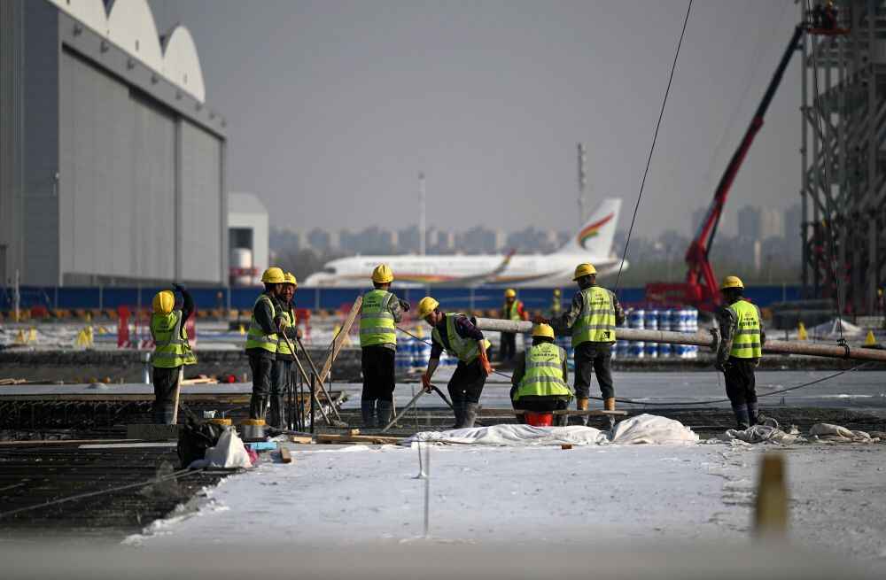 3月31日,工人在空客天津第二条总装线项目建设现场施工作业。(赵子硕 摄)