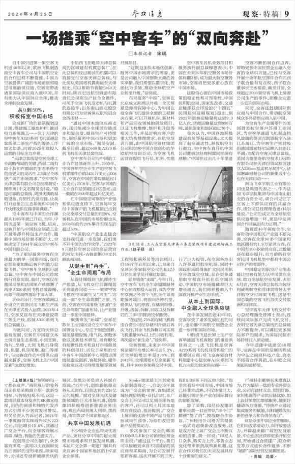 空客不断拓展合作边界,帮助更多中国民营企业融入空客的全球供应链。已经与空客开展十余年航空部件合作的西子联合最有发言权。西子联合董事长王水福说,截至目前,全球超过3000架空客飞机上装着公司生产的零件,助推企业进一步迈向国际市场。
