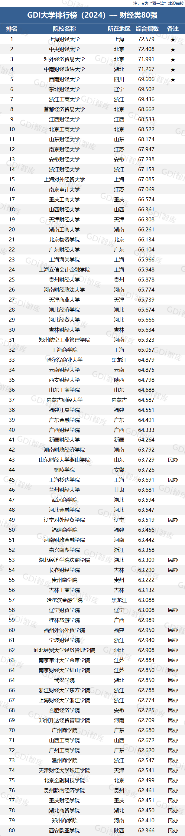 在“GDI大学排行榜(2024)— 财经类80强”中,上海财经大学、中央财经大学、对外经济贸易大学位居前三,排名四至十位的分别是:中南财经政法大学、西南财经大学、东北财经大学、浙江工商大学、首都经济贸易大学、江西财经大学和北京工商大学。
