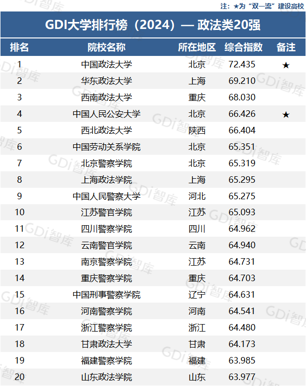 在“GDI大学排行榜(2024)— 政法类20强”中,中国政法大学、华东政法大学、西南政法大学位居前三,中国人民公安大学、西北政法大学分列第四、第五位。