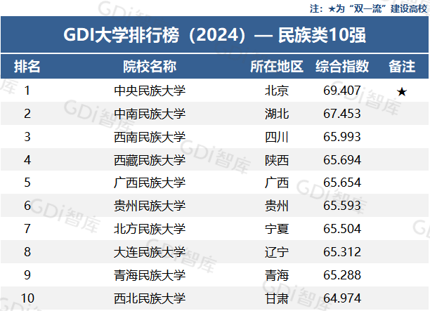 在“GDI大学排行榜(2024)— 民族类10强”中,中央民族大学、中南民族大学、西南民族大学位居前三,西藏民族大学、广西民族大学分列第四、第五位。