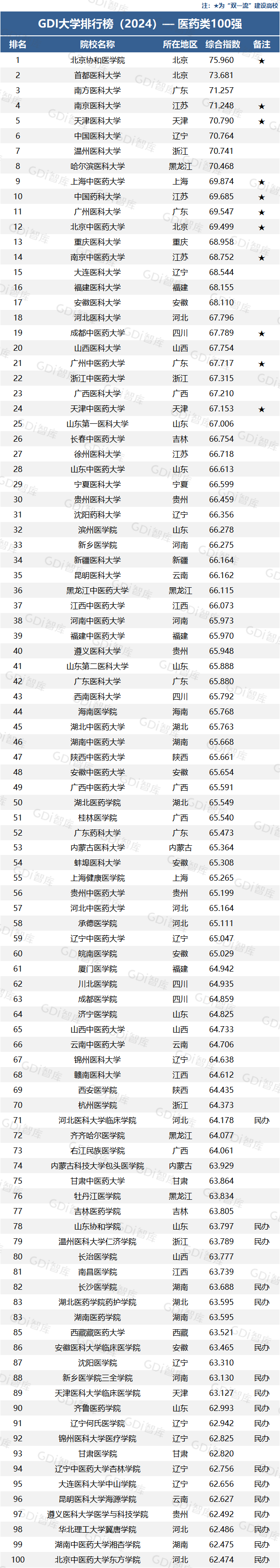 在“GDI大学排行榜(2024)— 医药类100强”中,北京协和医学院、首都医科大学、南方医科大学位居前三,排名四至十位的分别是:南京医科大学、天津医科大学、中国医科大学、温州医科大学、哈尔滨医科大学、上海中医药大学和中国药科大学。