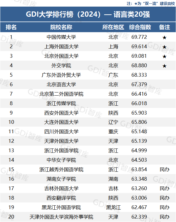 在“GDI大学排行榜(2024)— 语言类20强”中,中国传媒大学、上海外国语大学、北京外国语大学位居前三,外交学院、广东外语外贸大学分列第四、第五位。