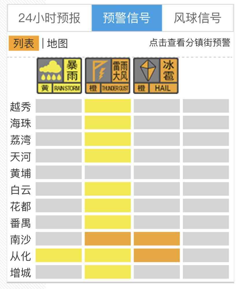 除了冰雹预警,截至26日20时30分,广州除黄埔区外,各区均维持发布雷雨大风黄色或以上预警信号,其中南沙发布雷雨大风橙色预警信号,从化区则发布暴雨黄色预警信号。
