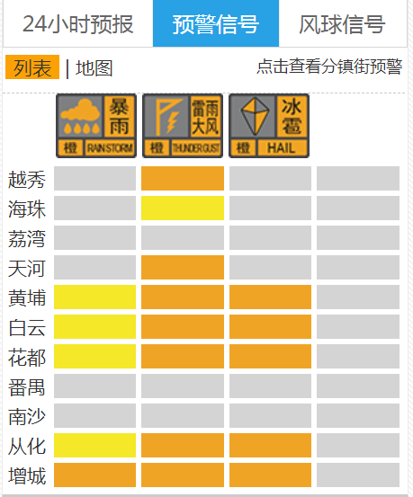 截至27日23时,广州部分行政区仍然发布较高等级预警信号。其中越秀、天河维持发布雷雨大风橙色预警信号;海珠发布雷雨大风黄色预警信号;黄埔、白云、花都、从化维持发布暴雨黄色、雷雨大风橙色、冰雹橙色预警信号;增城区维持发布暴雨、雷雨大风、冰雹等橙色预警信号;