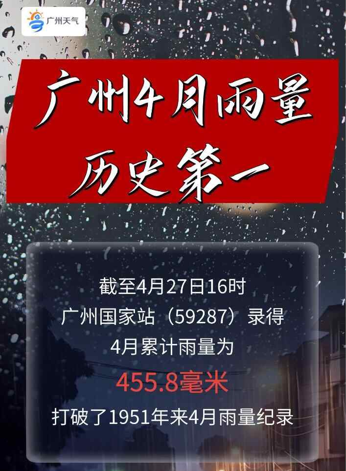 截至4月27日16时,广州国家站(59287)记录到的4月累计雨量为455.8毫米,打破了本站自1951以来的4月雨量纪录。