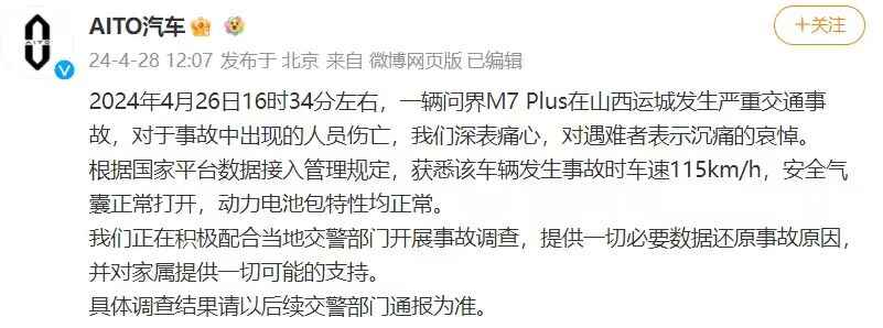 4月28日12时许,@AITO汽车 回应网传问界M7发生严重交通事故。其表示,根据国家平台数据接入管理规定,获悉该车辆发生事故时车速115km/h,安全气囊正常打开,动力电池包特性均正常。