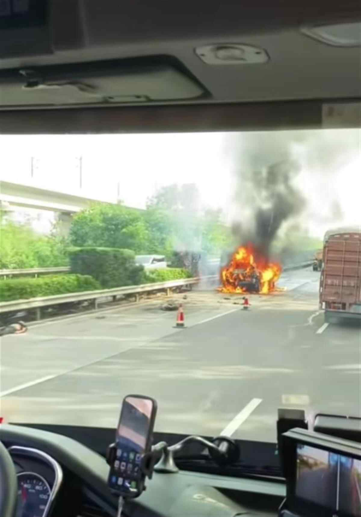 据这名发帖的网友称,4月26日下午3时左右,其弟弟驾驶着才买三个月的问界M7在山西运城夏县段高速公路上行驶,与前方一辆工程车追尾,追尾后车内发生起火,造成车上3名人员死亡。据其发布的视频,高速公路的快车道上,一辆黑色汽车追尾撞击一辆黄色水罐工程车,黑车前部起火,有人员破窗进行施救。另一个视频则显示,发生追尾的黑色汽车整车发生燃烧。