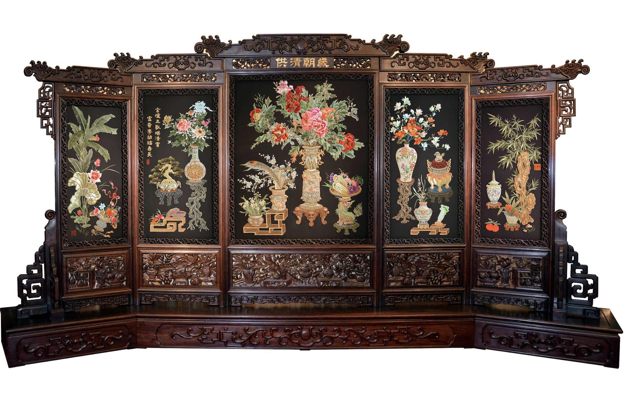 例如,位于“物华锦绣”展厅入口的“百工照壁”,可谓集岭南传统工艺之大成。“百工照壁”以木雕为框架,再经灰塑、潮州木雕、广彩瓷烧制技艺等12位非遗代表性传承人,经过将近两个多月奋战,分区块精心打造而成。为了让如此丰富而材质各异的非遗精品汇聚一堂,相得益彰,设计师对“百工照壁”每个板块尺寸都加以精确衡量,并在照壁中央镶上木雕“物华锦绣”四个金漆大字,使照壁富丽堂皇,极具岭南特色。
