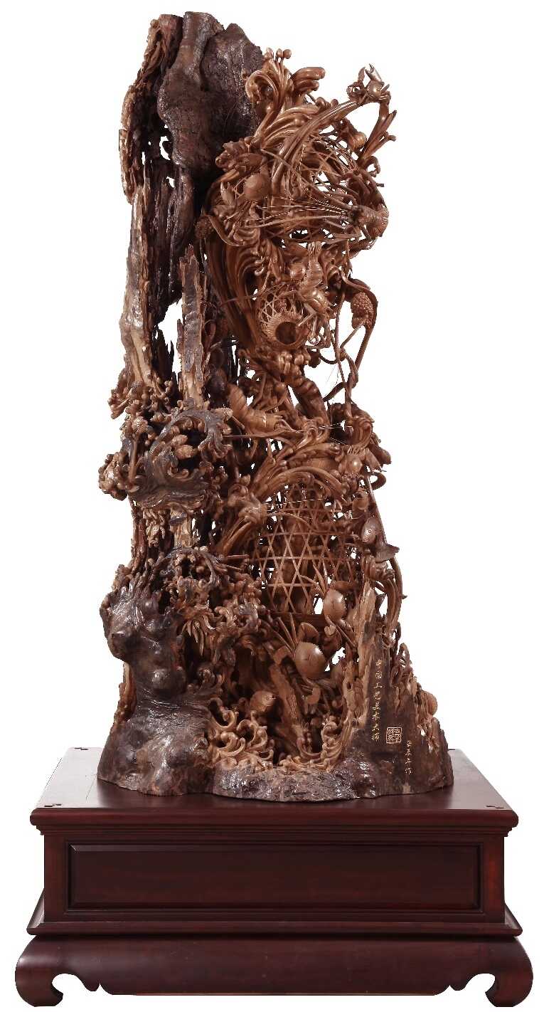 基本陈列主要展示了国家级、省级非遗代表性项目以及保护传承实践成果,其中不乏名家大师的经典之作。步入大堂,潮州木雕代表性传承人辜柳希《绽放》、金漆木雕《步步高》龙虾蟹篓迎面而来,玲珑剔透,浑然天成,充分体现作者艺术表现力。