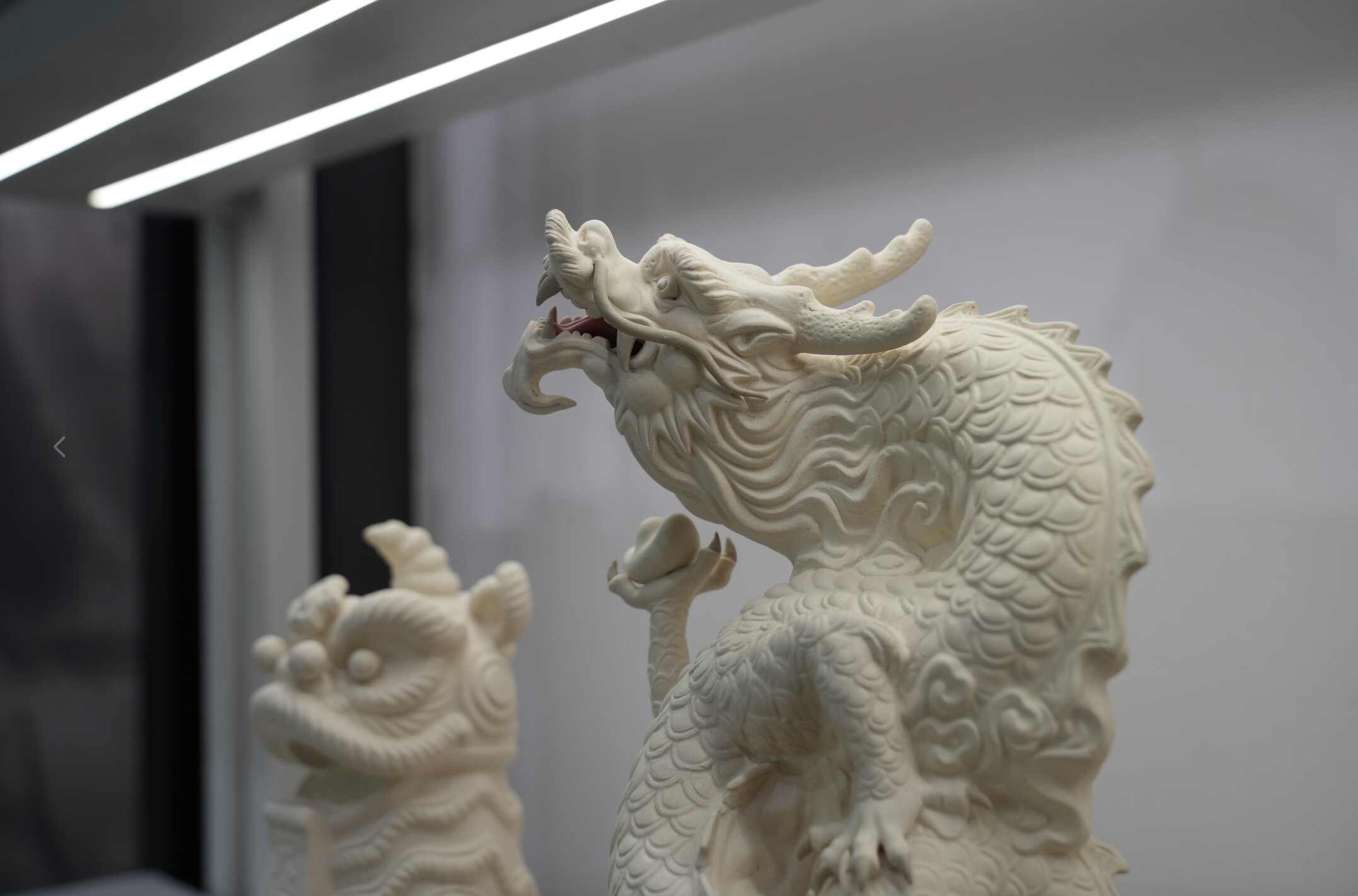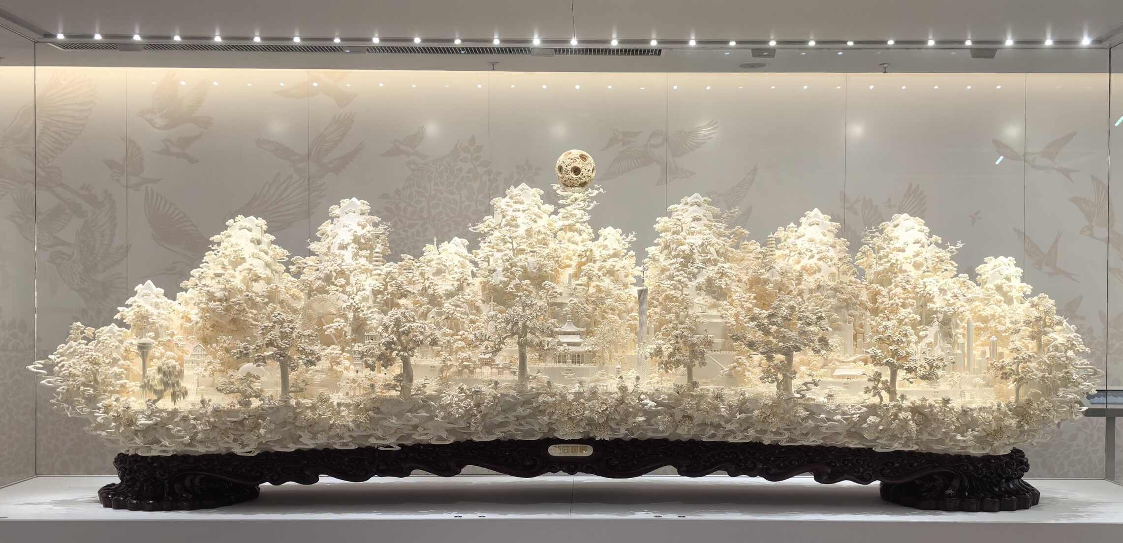 四楼展出的大型骨雕作品《湾区同心》是重磅展品之一。广州镇海楼、香港金紫荆广场、澳门大三巴、深圳前海国际会议中心、珠海大剧院等大湾区地标,在长达将近5米的骨雕里纤毫毕现,栩栩如生。顶端猛犸象牙球达31层之多,令人叹为观止。