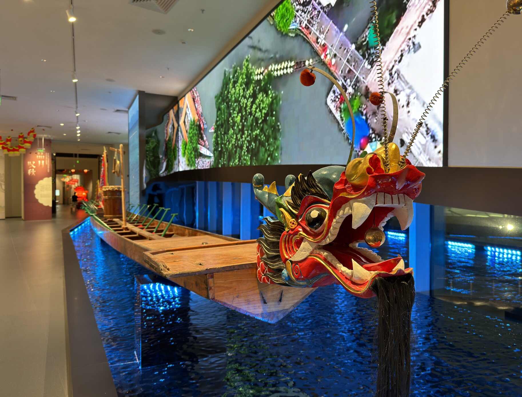 作为整个非遗馆规模最大的一件展品,它的展陈布置也花了不少心思。龙舟下方运用现代科技做出了水波纹的效果,同时透过玻璃幕墙,室外的珠江水景恰巧进入视线,与龙舟的陈列相互映衬,相得益彰,将“观展”与“观景”相结合,既生动又富有感染力。
