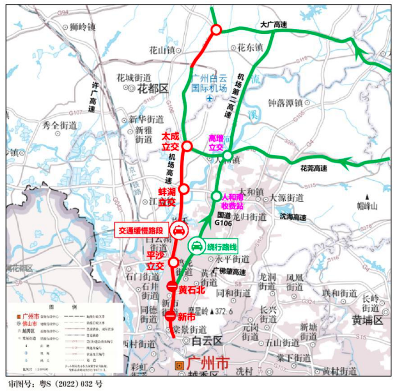 为避开花山北互通立交—花山隧道段路行车缓慢路段,建议在太成立交绕行G106国道至梯面继续北上,或在蚌湖立交、太成立交通过花莞高速、机场第二高速至广连高速绕行北上。