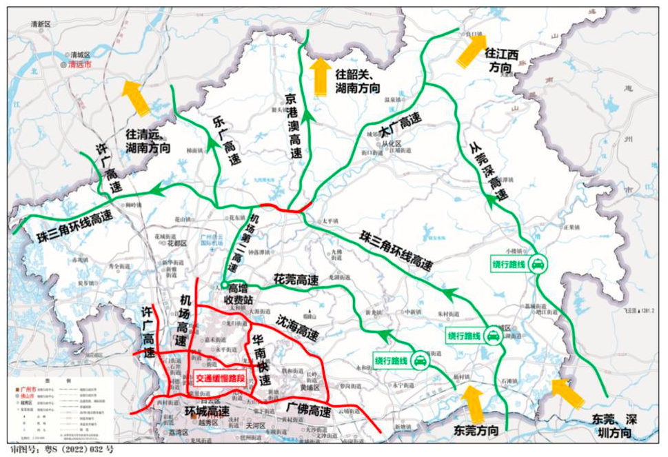 除上述经常性行车缓慢路段外,在节假日出城高峰,北环、沈海高速(北二环)、南环-广珠西线高速、广深沿江高速(官田互通立交段)也可能出现车流密集情况。同时,广清高速清远立交段受清远交警保畅通措施影响,也可能出现行车缓慢情况。