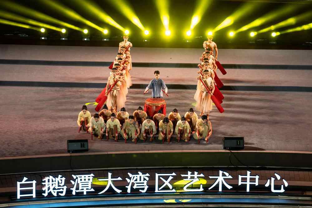 铿锵鼓点奏起,白鹅潭大湾区艺术中心启用仪式拉开帷幕。八头雄狮抖擞身躯、交错起伏,展现岭南雄直之气。此时此刻,珠江沿岸流光溢彩,“鹅潭放歌”综艺晚会同步举行。精彩节目汇聚大湾区传统与现代的文化艺术元素,与白鹅潭艺术中心融为一体,充分展现岭南文化的独特魅力。