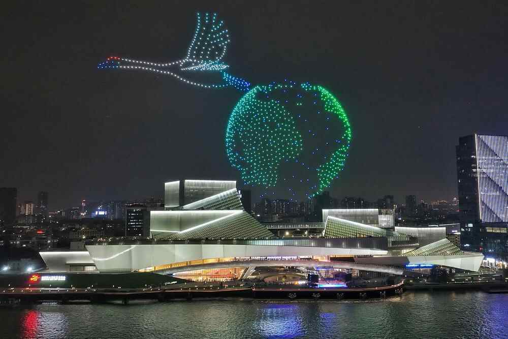 该画作由广东岭南画派著名画家关山月和著名山水画家傅抱石在上世纪联袂创作,展现岭南山水风貌。表演尾声,无人机变化出粤剧花旦、白鹅潭大湾区艺术中心建筑形象等图案,闪耀珠江夜空。