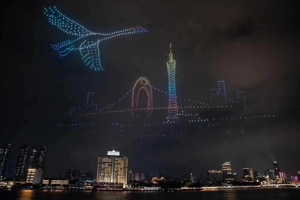 21时许,排列整齐的无人机队列升上夜空,珠江沿岸流光溢彩,将晚会推向高潮。15分钟的无人机表演以独特的编队飞行和精妙造型设计,将现代科技与传统艺术完美融合,展现出一幅幅美轮美奂的图案。