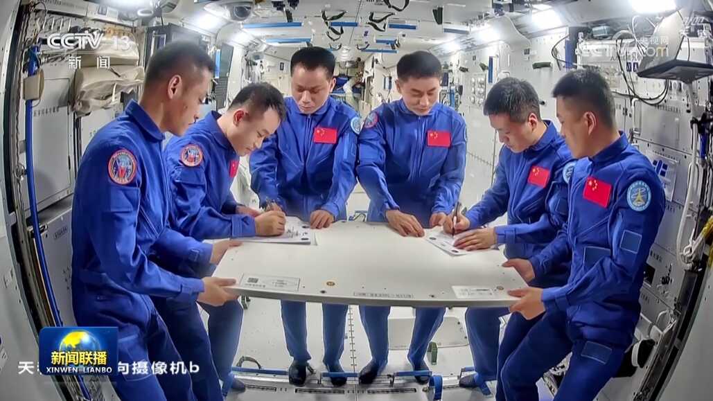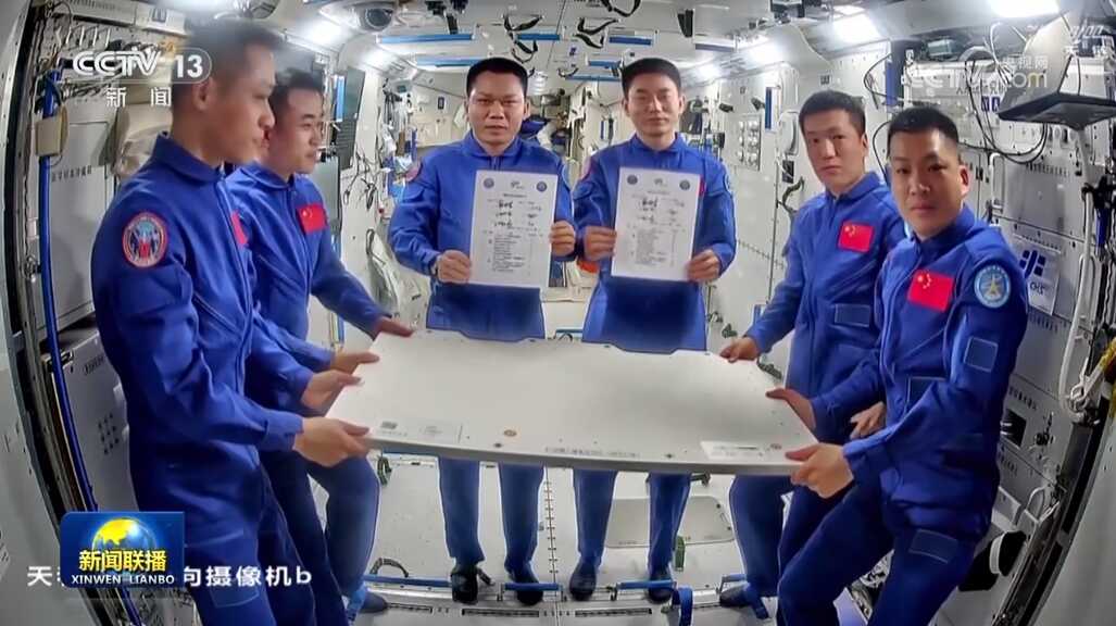 下午三时许,神舟十七号航天员汤洪波、唐胜杰、江新林和神舟十八号航天员叶光富、李聪、李广苏在空间站天和核心舱在轨举行交接仪式,6名航天员分别在确认书上签字。