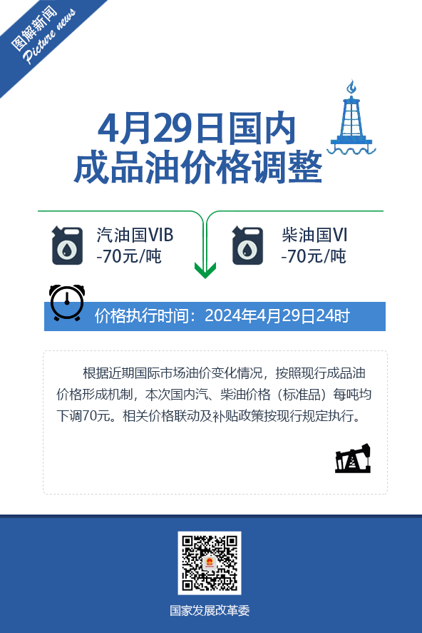 据国家发展和改革委员会网站消息,根据近期国际市场油价变化情况,按照现行成品油价格形成机制,自2024年4月29日24时起,国内汽、柴油价格(标准品,下同)每吨均降低70元。调整后,各省(区、市)和中心城市汽、柴油最高零售价格见附表。