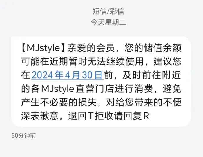 近期,不少MJstyle会员都收到一条消息:“亲爱的会员,您的储值余额可能在近期暂时无法继续使用,建议您在2024年4月30日前,及时前往附近的各MJstyle直营门店进行消费……”
