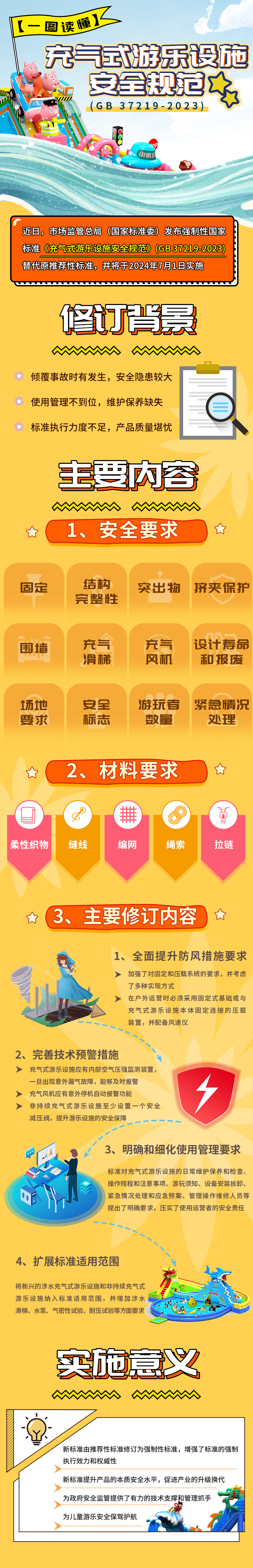 新标准在原来推荐性标准基础上全面提升了充气式游乐设施的安全要求,并全文强制实施。针对易倾覆的问题,加强了对固定和压载系统的要求。