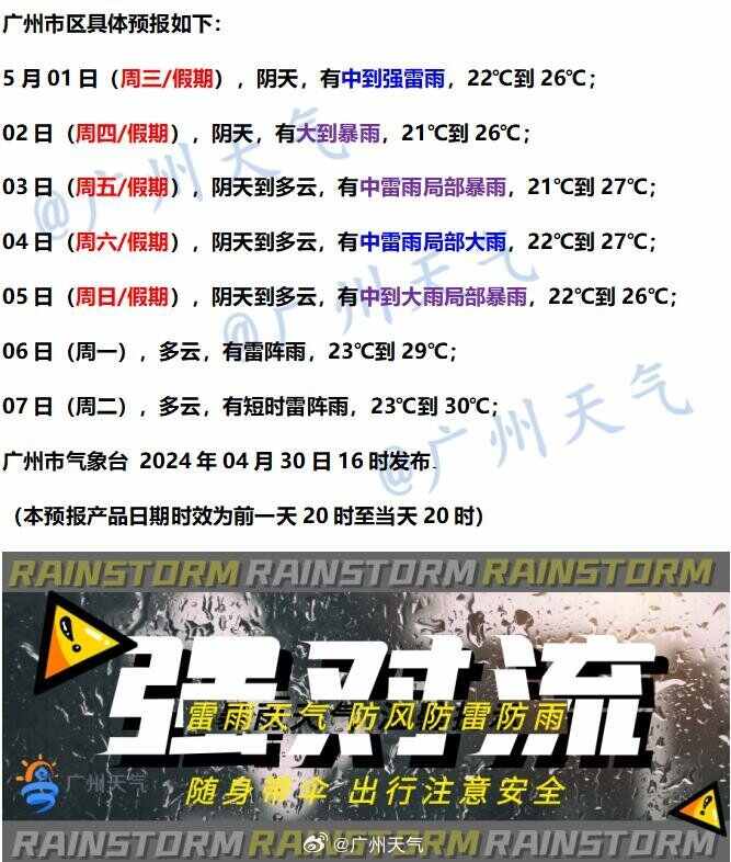 中雨、大雨、暴雨、雷雨……“五一”假期,广州将有各种雨。