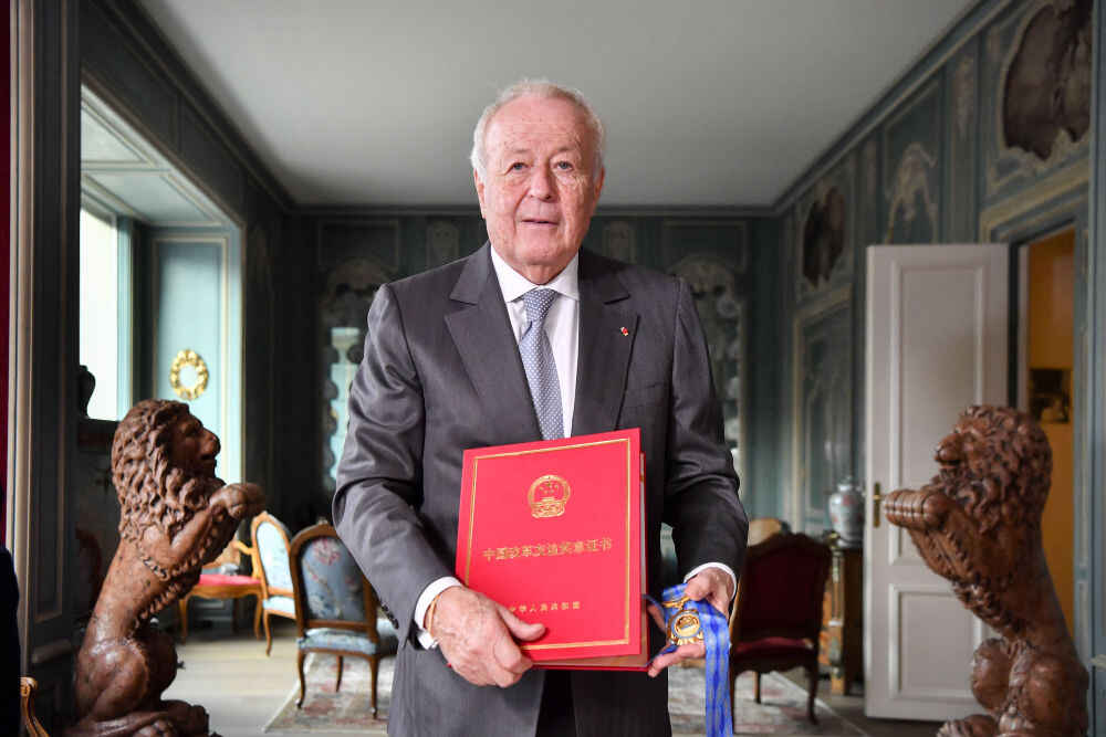 2018年12月20日,阿兰·梅里埃在法国里昂办公室展示中国改革友谊奖章及证书。新华社记者陈益宸摄
