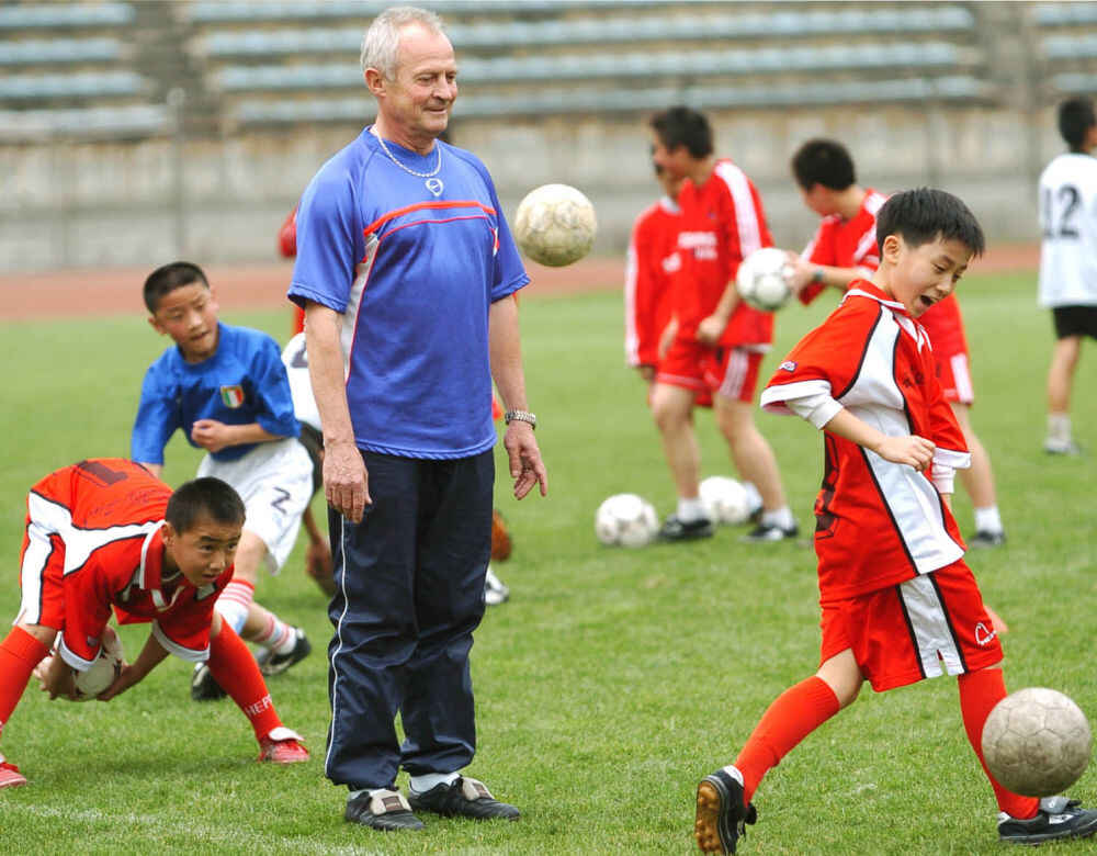 ↑2004年4月11日,法国青少年足球专家艾迪·米歇尔·于当希(中)应邀在贵阳辅导小学员训练。