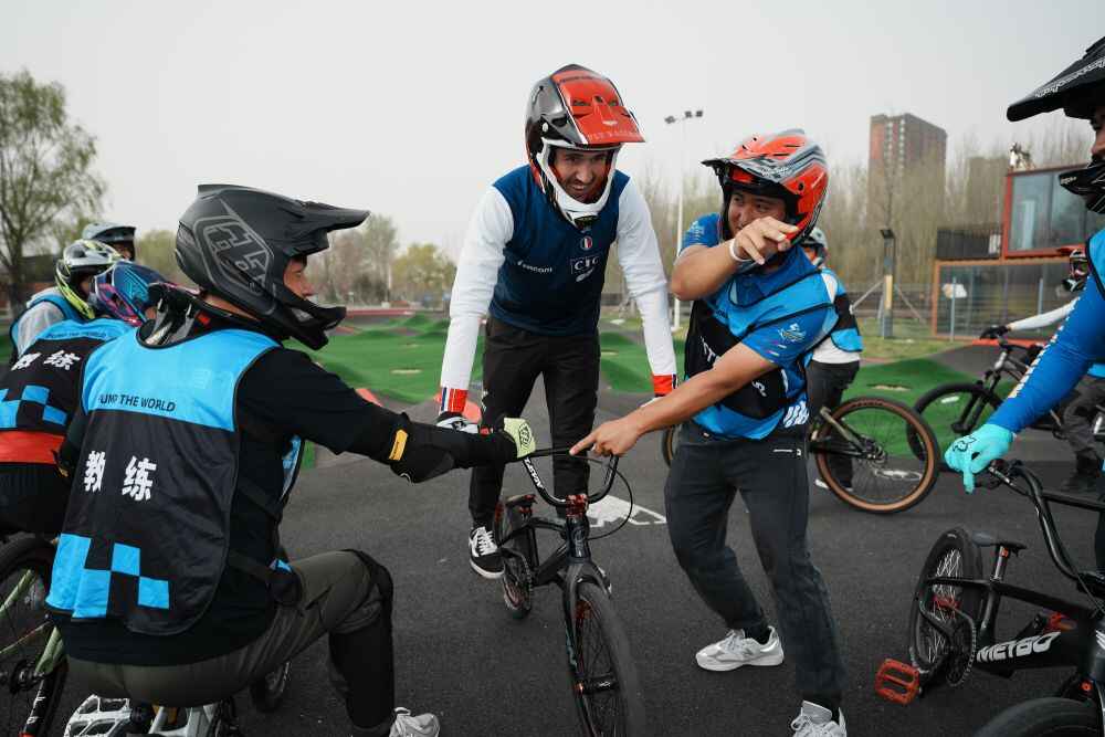 ↑2024年4月15日,在沈阳国际泵道公园,法国导师蒂博·杜邦(中)在中法合作初级泵道教练员培训中为学员演示技术动作。