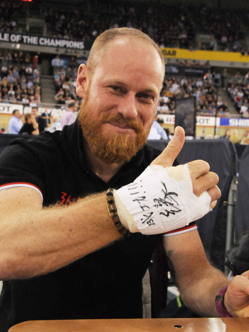 ↑2016年3月6日,2016场地自行车世锦赛赛场上,中国队的法国籍教练韦蒂展示右手绷带上的汉字“成功!!!缘”。