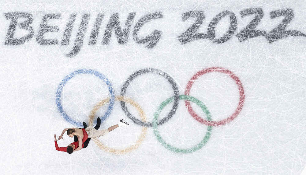 ↑2022年2月14日,法国选手加布丽埃拉·帕帕达基斯(上)和纪尧姆·西泽龙在北京2022年冬奥会花样滑冰冰上舞蹈比赛中,他们最终夺得该项目冠军。