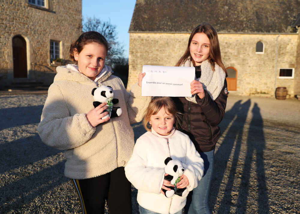↑2022年1月14日,在法国芒什省梅奥蒂市,10岁的安娜埃尔·玛丽昂、5岁的卡米耶·玛丽昂和12岁的诺拉·玛丽昂(从左至右)手举“一起向未来”的主题口号,祝福北京冬奥会。