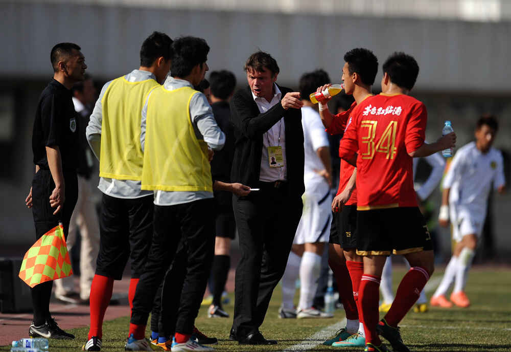 ↑2013年4月13日,时任深圳红钻队法国主教练特鲁西埃(中)在2013/2014赛季中国足球甲级联赛第五轮中布置战术。