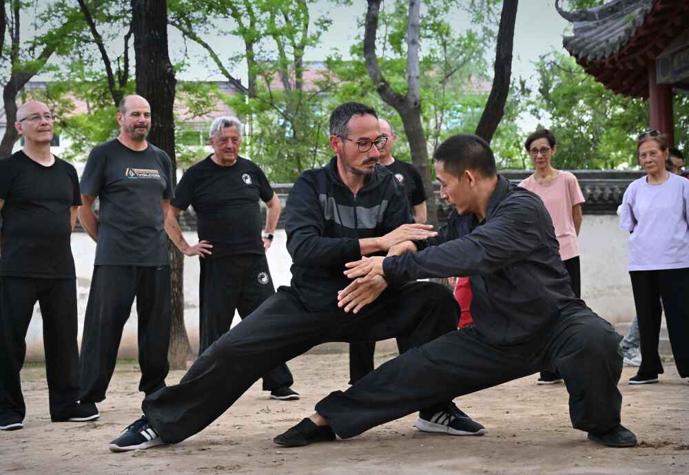 ↑2024年4月20日,在河南温县陈家沟杨露禅学拳处,来自法国波尔多的陈少拳(左)与师父陈自强交流太极推手。