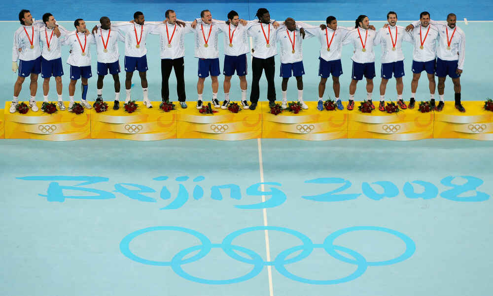 ↑2008年8月24日,法国队球员在北京奥运会男子手球冠军领奖台上高唱国歌。