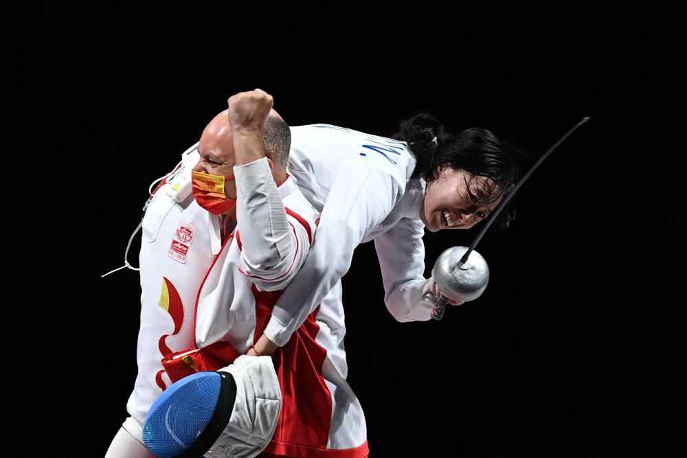 ↑2021年7月24日,孙一文(右)与法国籍主教练雨歌·欧伯利在东京奥运会击剑项目女子个人重剑决赛夺冠后庆祝。