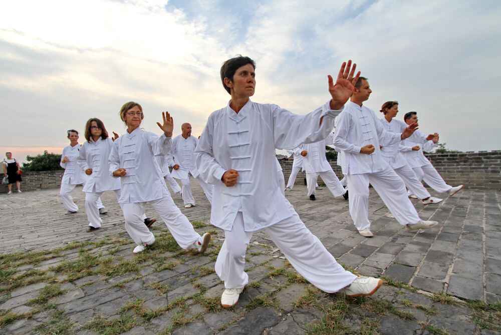 ↑2017年8月10日,来自法国的太极拳爱好者在河北省永年县广府古城城墙上展示太极拳。