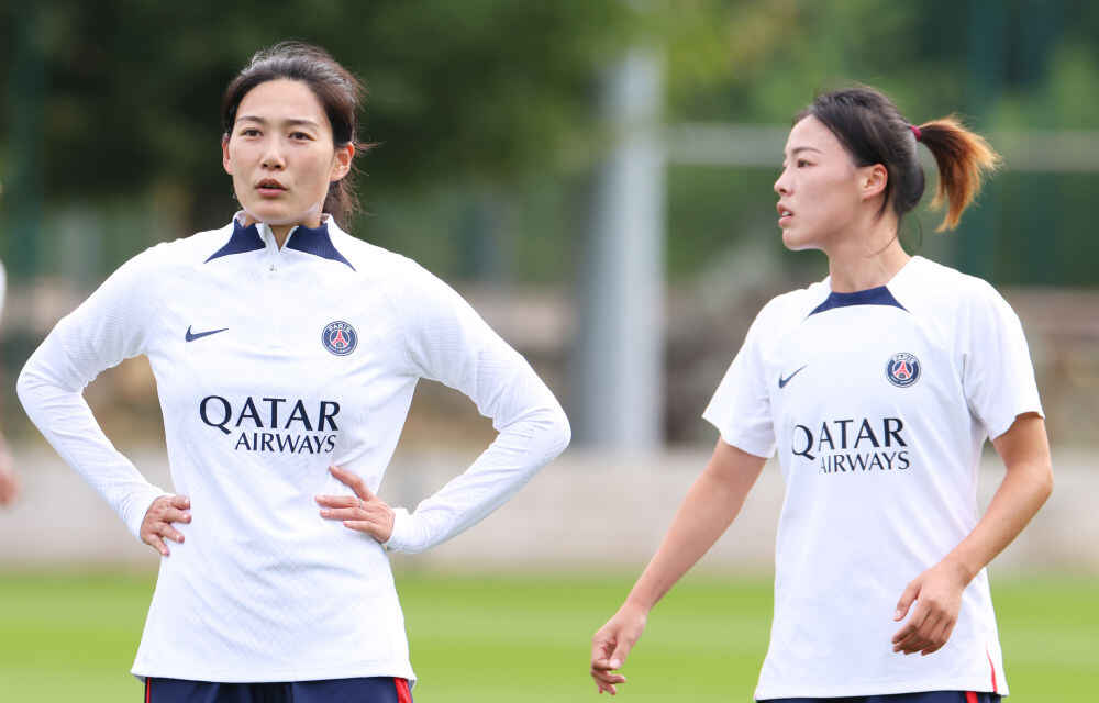 ↑2022年9月16日,杨莉娜(左)和李梦雯在位于巴黎近郊布日瓦勒的训练基地参加赛前训练。