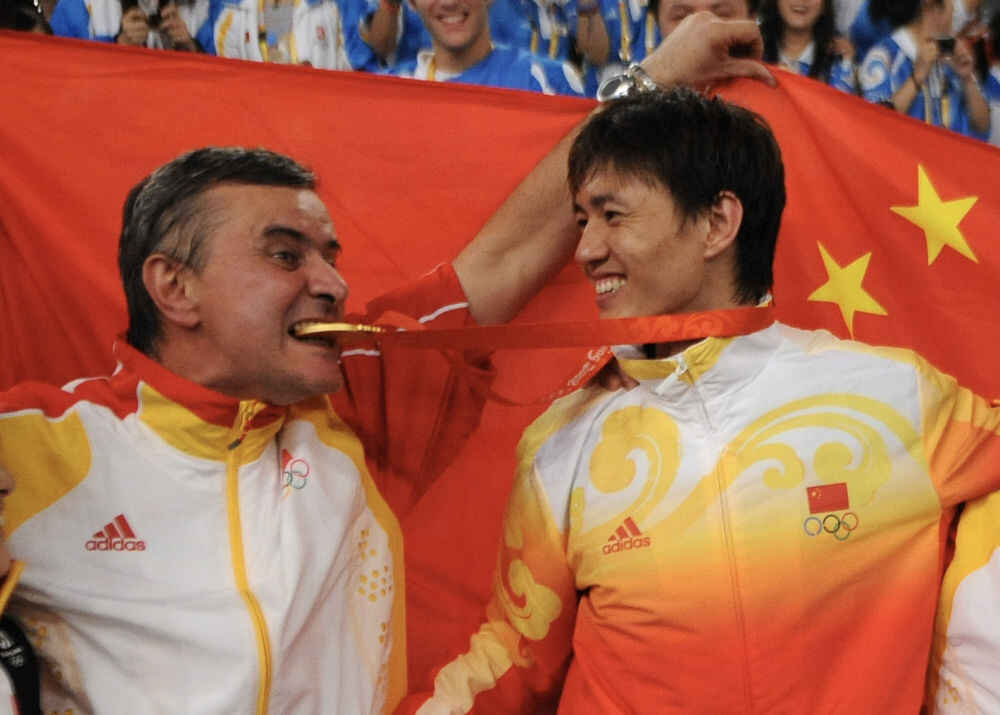 ↑2008年8月12日,中国选手仲满(右)和法国籍教练克里斯蒂安·鲍埃尔披上五星红旗,庆祝仲满在北京奥运会男子佩剑个人决赛中战胜法国选手尼古拉·洛佩,获得冠军。