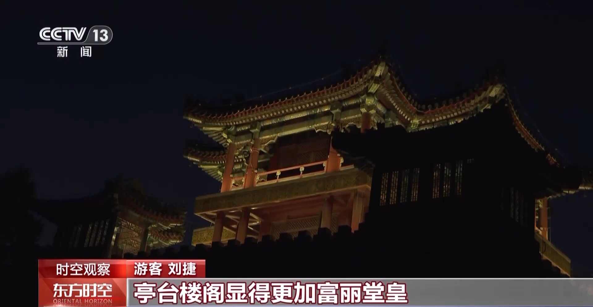 游客 刘捷:亮了灯以后,夜晚的颐和园就更加美了。亭台楼阁显得更加富丽堂皇,和白天不一样金碧辉煌的感觉。