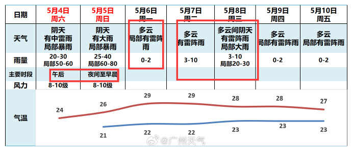 根据广州市气象台5月4日上午会商预报结论,4日余下时间至5日广州局部累计雨量仍可达到暴雨量级,但强降水天气有望在5日白天起出现减弱迹象;预计6日广州市区多云局部有雷阵雨;展望7日至10日广州雨势以雷阵雨为主,相比前期暴雨量级降水要收小,但预计受7日至8日间弱冷空气配合切变线影响,8日广州市区局部雨量可达大雨量级。