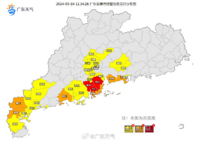 截至4日11时34分,广东共有34个暴雨预警信号生效,其中新会、中山、斗门暴雨红色预警信号生效,阳江、珠海、深圳、遂溪、廉江等5个市县暴雨橙色预警信号生效。