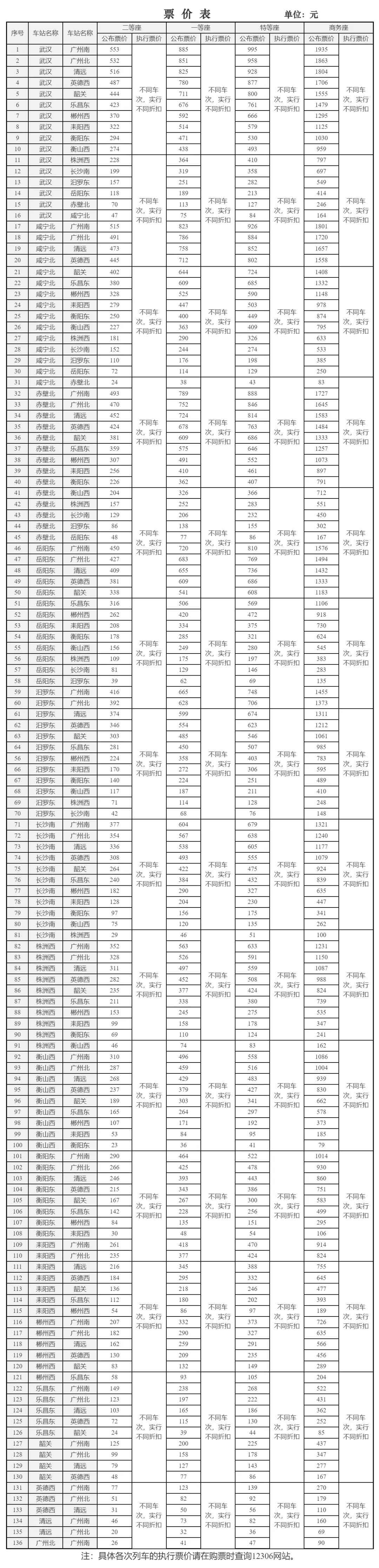 武广铁路客运专线有限责任公司发布的武广调价公告显示,如武汉站至广州南站的二等座最低票价为304元,较现票价低约34%。沪杭铁路客运专线股份有限公司发布的沪杭调价公告显示,如上海虹桥站至杭州东站的二等座最低票价为48元,较现票价低约34%。沪昆铁路客运专线浙江有限责任公司、沪昆铁路客运专线江西有限责任公司、沪昆铁路客运专线湖南有限责任公司发布的杭长调价公告显示,如杭州东站至长沙南站的二等座最低票价为267元,较现票价低约34%。杭甬铁路客运专线有限责任公司发布的杭甬调价公告显示,如杭州东站至宁波站的二等座最低票价为47元,较现票价低约34%。