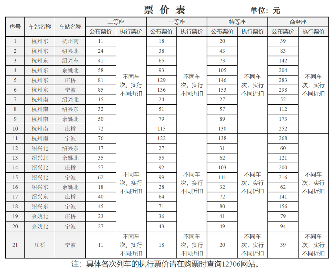 上述四则公告均指出,各站间执行票价将以公布票价为上限、5.5折为下限实行多档次、灵活折扣的浮动票价体系,为旅客出行提供更多的选择。具体各次列车的执行票价请在购票时查询12306网站。