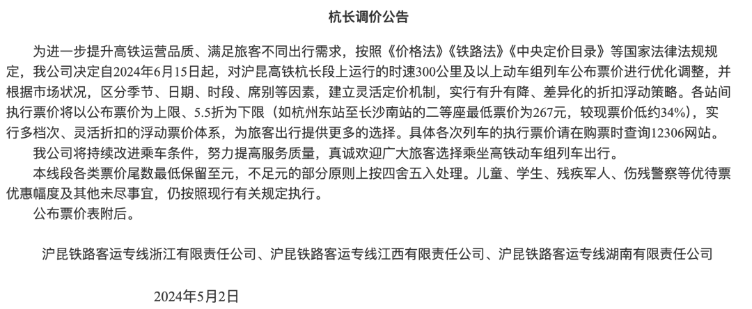 近日,铁路12306官网发布四则调价公告。公告指出,为进一步提升高铁运营品质、满足旅客不同出行需求,决定自2024年6月15日起,对京广高铁武广段、沪昆高铁沪杭段、沪昆高铁杭长段、杭深铁路杭甬段上运行的时速300公里及以上动车组列车公布票价进行优化调整,并根据市场状况,区分季节、日期、时段、席别等因素,建立灵活定价机制,实行有升有降、差异化的折扣浮动策略。