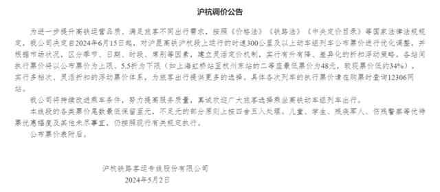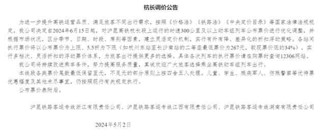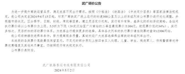 中国铁路12306网站显示,武广、沪杭、杭长、杭甬均于5月2日发布了调价公告。根据公告,自2024年6月15日起,京广高铁武广段、沪昆高铁沪杭段、沪昆高铁杭长段及杭深铁路杭甬段上运行的时速300公里及以上动车组列车公布票价将进行优化调整。