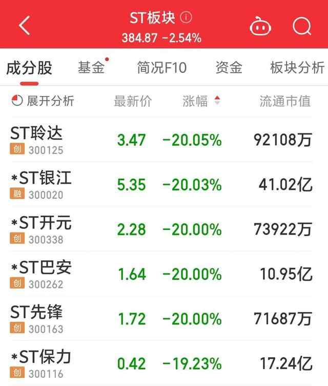 值得注意的是,ST股早盘迎来跌停潮,ST聆达、ST银江、ST保力等5只创业板股跌停(-20%),ST阳光、ST美吉、ST联络等50多股跌停(-5%)。