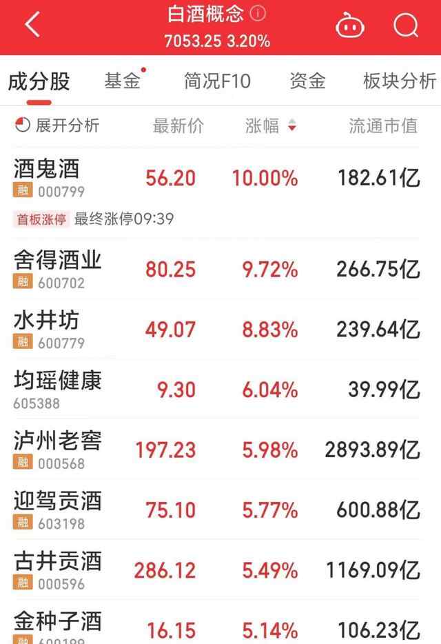 除此之外,白酒概念指数涨超3%,酒鬼酒涨停,舍得就业涨超9%,泸州老窖、古井贡酒涨超5%,五粮液涨超4%,贵州茅台涨超3%。