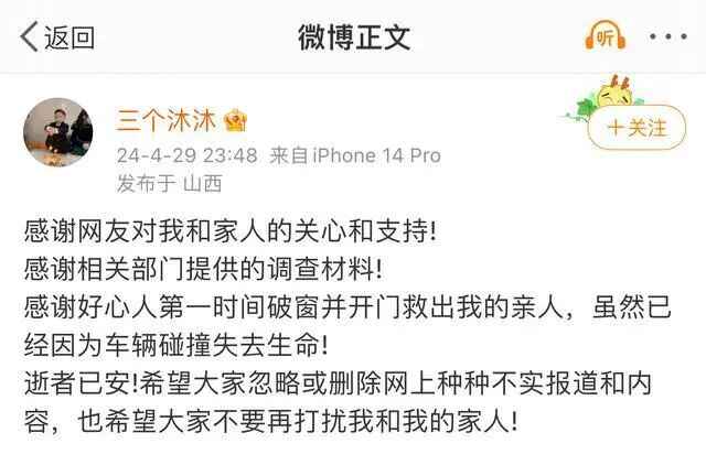 4月29日,事故家属发布最新声明称,“感谢好心人第一时间破窗并开门救出我的亲人,虽然已经因为车辆碰撞失去生命,逝者已安,希望大家忽略或删除网上种种不实报道和内容,也希望大家不要再打扰我和我的家人。”