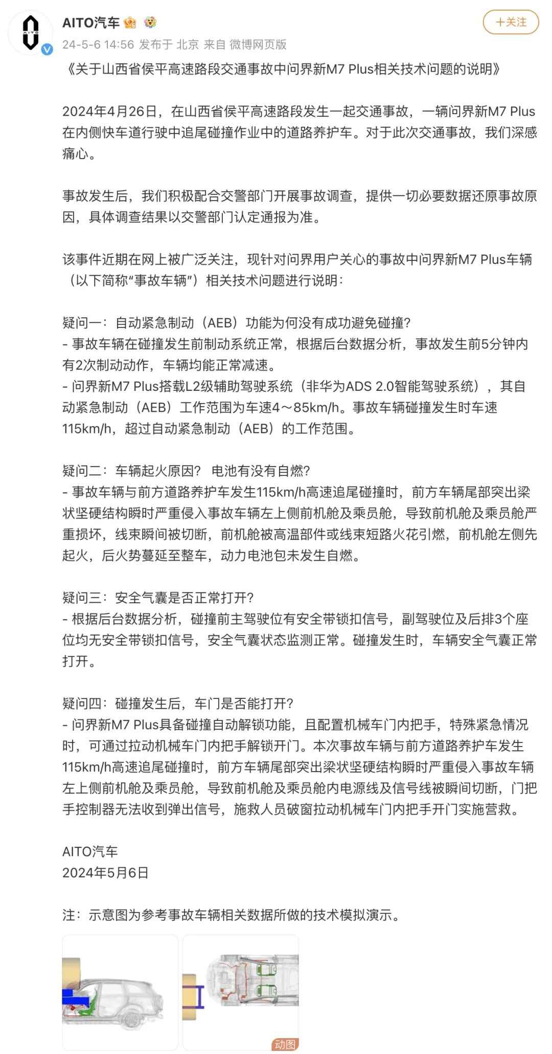 5月6日下午,@AITO汽车 发布《关于山西省侯平高速路段交通事故中问界新M7 Plus相关技术问题的说明》,首次披露其官方调查的结果。详情如下: